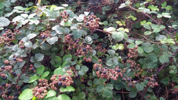 If you have been following the thread on this blog about rewilding here at Yewfield one plant that is hard to escape from both figuratively and physically is bramble or blackberry or Rubus fruticosus. Call it what you will. It can be a scourge in most parts of the garden but if contained can be an important habitat in a wildlife garden. Ground nesting birds such as warblers love a patch of bramble and for our bees it is probably the most important plant in their diet. At this time of year the fruit is a bonus to an apple crumble as well as to blackbirds and thrushes. We have allowed a patch to develop by the eastern boundary of the garden but will have to be ruthless in keeping it contained. It’s all part of our ‘garden jungle’.